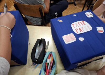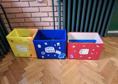 Od rujna, nakon kratke pauze zbog ljetnih školskih praznika, nastavili smo rad na eTwinning projektu „Zero Waste”. Učenice su marljivo izradile kutije za reciklažu od starih kutija koje su nam preostale od udžbenika i bilježnica koje su stigle na adresu škole. U pravo vrijeme, jer su nam bile potrebne kutije za reciklažu. Kutije su obložile krep papirom u bojama, ovisno koju vrstu otpada je potrebno ubaciti. Naši učenici najviše imaju otpad od papira, plastike i pokoju bateriju, te smo i izradili te kutije. Na kutije su ručno ispisali nazive na hrvatskom i engleskom i nacrtali primjere otpada koji spada u koju kutiju. Kutije smo smjestili u učionice engleskog jezika i biologije i kemije. Na ovaj način se nadamo potaknuti sve učenike koji ulaze u ove dvije učionice da odvajaju otpad i time pridonesu „Zero waste” filozofiji.
