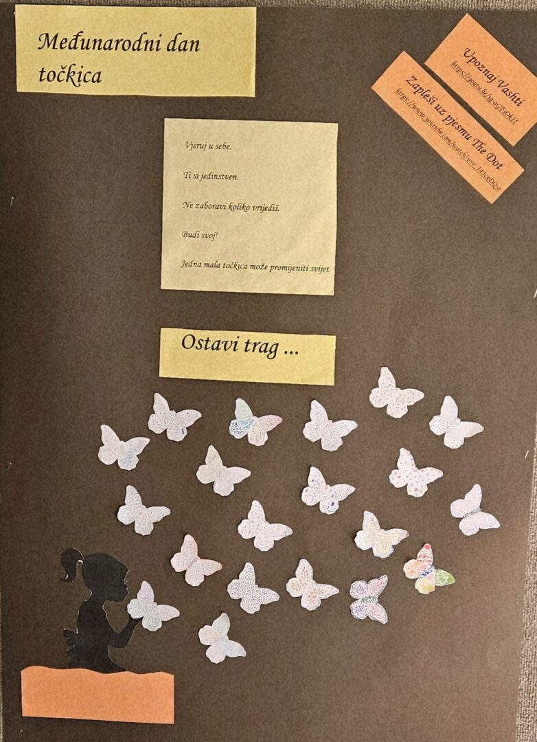 Učenici 5. b razreda na Satu razrednika obilježili su Međunarodni dan točkica. Riječ je o globalnoj proslavi kreativnosti, hrabrosti i suradnje. Začetnik događanja je američki učitelj Terry Shay koji je u svoj razred donio knjigu kanadskog pisca Petera H. Reynoldsa ” The Dot”, njome oduševio svoje učenike i započeo nešto što će prerasti u svjetsku manifestaciju. Točka je priča o brižnoj učiteljici koja izaziva sumnjičavu učenicu Vashti da vjeruje u vlastite sposobnosti tako što je dovoljno hrabra da „ostavi svoj trag“. Ono što počinje malom točkom na komadu papira postaje proboj u samopouzdanju i hrabrosti, pokrećući putovanje samospoznaje i dijeljenja, koje je inspiriralo bezbroj djece i odraslih diljem svijeta.