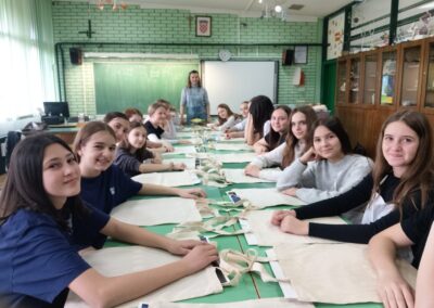 Gošća je donijela sav potreban pribor za radionicu te je na početku učenicama detaljno objasnila postupak rada. Upoznala ih je s materijalima koji se koriste, načinom ukrašavanja torbi te postupkom izrade matrice za otisak, pri čemu je posebno naglasila važnost pravilne izrade „matrice“ tj. podloge.. Također je donijela primjere radova kako bi učenicama olakšala razumijevanje zadatka.