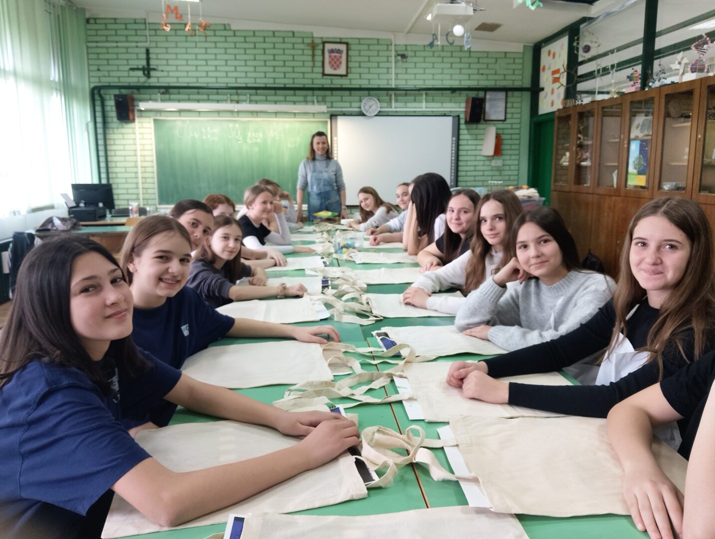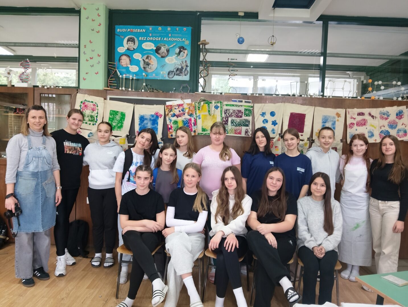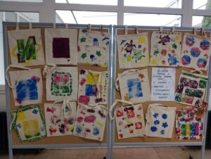 U ulaznom holu škole postavljena je izložba unikatnih platnenih torbi nastalih na radionici koju je