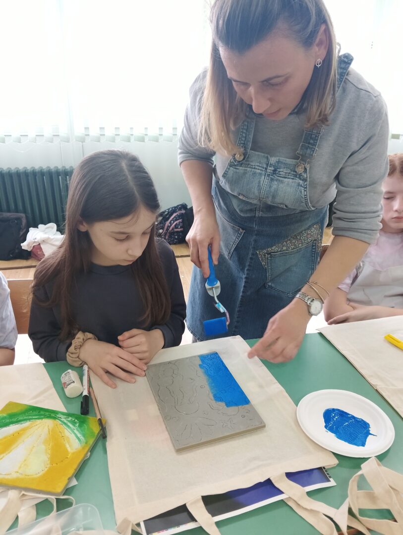 Nakon izrade matrica, učenice su pomoću valjka nanosile boju na matricu te otiskivale uzorke na platnene torbe. Dobivene torbe ostavljene su na sušenje, a po završetku sušenja potrebno ih je opeglati kako bi se boja fiksirala i ostala postojana nakon pranja.
